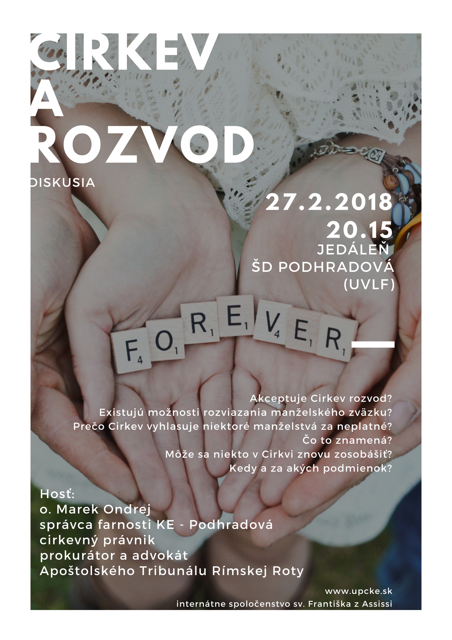 Pozývame na prednášku s diskusiou na tému: Cirkev a rozvod, ktorá bude v Internátnom spoločenstve na Podhradovej v utorok, 27.2.2018, o 20.15 hod. v Jedálni ŠD Podhradová. Hosťom bude o. Marek Ondrej. Pred prednáškou bude svätá omša o 19.30 hod.
